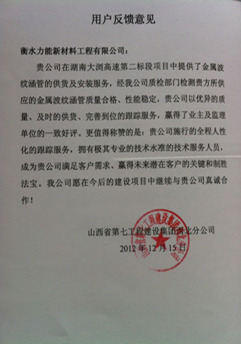 貴公司在湖南大瀏高速第二標段項目中提供了金屬波紋涵管的供貨及安裝服務(wù),經(jīng)我公司質(zhì)檢部門(mén)檢測貴方所供應的金屬波紋涵管質(zhì)量合格,性能穩定,貴公司以?xún)?yōu)異的質(zhì)量,及時(shí)的供貨,完善到位的跟蹤服務(wù),贏(yíng)得了業(yè)主及監理單位的一致好評。更值得稱(chēng)贊的是:貴公司施行的全程人性化的跟蹤服務(wù),擁有極其專(zhuān)業(yè)的技術(shù)水準的技術(shù)服務(wù)人員,成為貴公司滿(mǎn)足客戶(hù)需求,贏(yíng)得未來(lái)潛在客戶(hù)的關(guān)鍵和制勝法寶。我公司愿在今后的建設項目中繼續與貴公司真誠合作!
