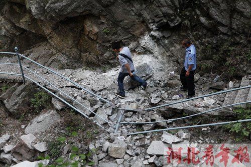 一雙紅色的男士運動(dòng)鞋,躺在碎石塊中,眼鏡、相機、零食散落一地。出事景點(diǎn)的山道下,已樹(shù)立了一個(gè)木制的牌子,“前方施工,禁止通行!辈⑴扇藛T把守,阻止游客進(jìn)入。 ■“碎石如雨點(diǎn)一般墜落” 昨日下午,記者在醫院見(jiàn)到了多名傷者,他們都是河北師范大學(xué)職業(yè)技術(shù)學(xué)院與河北經(jīng)貿大學(xué)的學(xué)生。頭上纏著(zhù)繃帶的石海還沉浸在驚恐中,他告訴記者,悲劇發(fā)生時(shí),他正要通過(guò)一座小橋。 “一聲巨響,碎石如雨點(diǎn)一樣,從山上飛落下來(lái)”,他說(shuō),好多人瞬間被碎石砸中。這一過(guò)程大約持續了六七秒鐘,之后山路上騰起一片煙塵。 在石海亮身后大約20米,處于安全地帶的房明宇目睹了這一過(guò)程,時(shí)間是11時(shí)30分許,“抬頭一看,路左側山頂有一塊巨石正滾落下來(lái),巨石又砸到山壁上,碎成了小塊向下飛濺! ■輪流背著(zhù)同學(xué)走了30分鐘 房明宇回憶說(shuō),突如其來(lái)的變故,讓他遲愣了幾秒鐘。直到聽(tīng)到有人喊,“快去救受傷的人! 他和班里十幾個(gè)男生立馬迎了上去!耙幻鷾喩硎茄,另一名胳膊受傷的男生扶著(zhù)她,邊往下走邊喊救命!狈棵饔钫f(shuō),他小跑著(zhù)過(guò)去,背起這個(gè)女生就往山下的醫務(wù)室走。房明宇不敢走得太快,與同學(xué)李江浩交替著(zhù)背了30多分鐘,把她送到了景區的醫務(wù)室。 一個(gè)在小橋上拍照的游客,被石頭砸中頭部,直接掉到了橋下的溪水里。陳振陽(yáng)、趙二松、張強、高猛四個(gè)同學(xué),趕過(guò)去后,直接跳入水中,把那個(gè)男生抬到了岸邊。但由于傷勢過(guò)重,該男生不久死亡。 隨后,受傷的學(xué)生們,被先后送往醫院。 ■景區稱(chēng) 滾石與下雨有關(guān) 王習杰稱(chēng),此次景區的山頂滾落石塊,與5月11日的下雨有關(guān)!拔覀兘(jīng)常派人員對松動(dòng)的石頭進(jìn)行檢查,一旦松動(dòng),就會(huì )及時(shí)處理!蓖趿暯苷f(shuō),“但有些地方太高,人根本夠不著(zhù)! 據了解,在事故中死亡的男孩,為河北經(jīng)貿大學(xué)的學(xué)生。目前,景區與靈壽縣旅游局都在積極處理善后事宜。